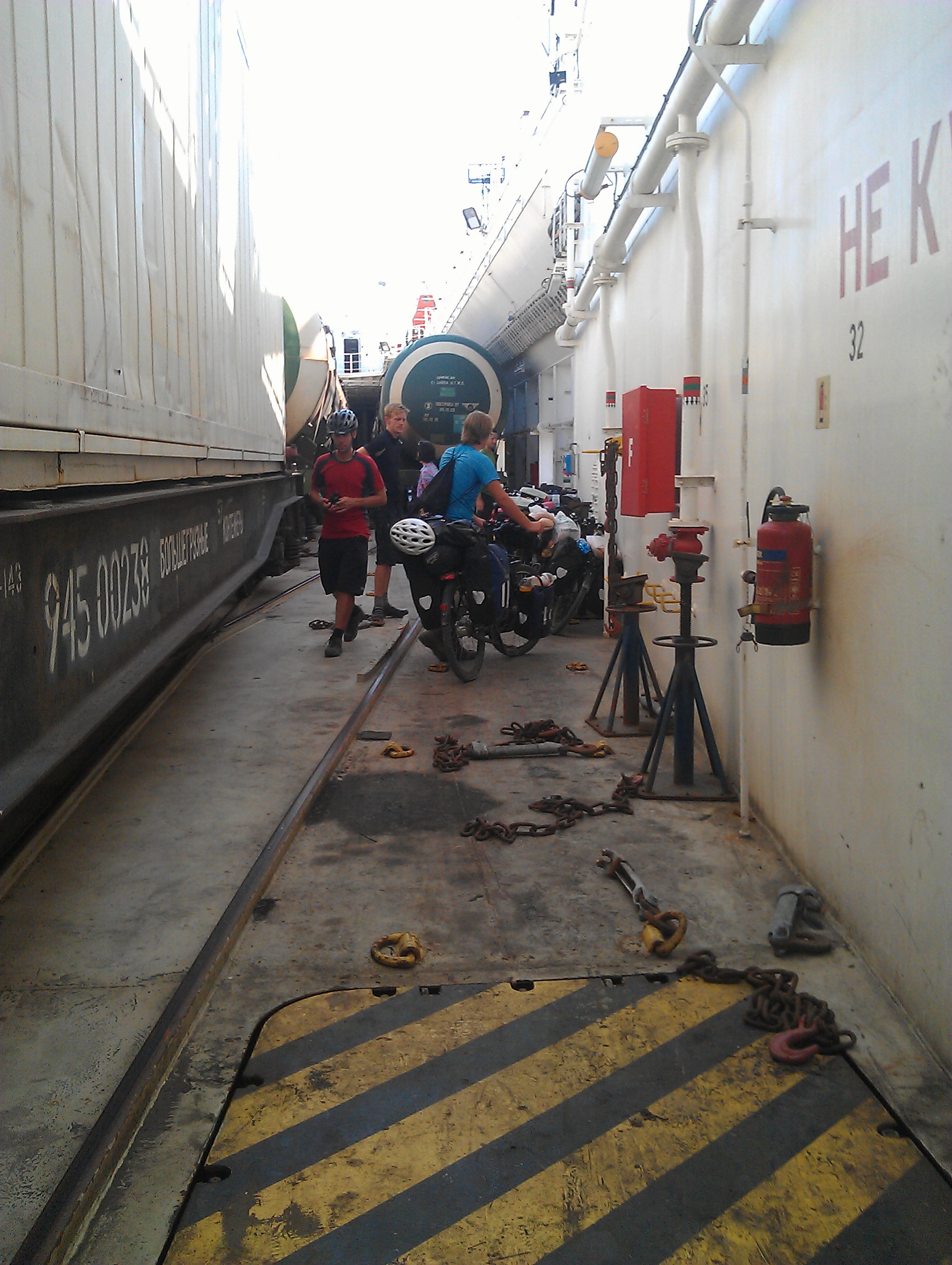 After 6 days and another beer heavy night of cyclists chat and ‘rocking out’ in one of the ex-pat bars I was woken in the hostel to the news there was a boat leaving. I think I was probably still drunk as I phoned another cycle couple waiting for the news (Anina and Paul), scrambled everything onto Carra and wobbled across town to the port. In our favor the hostel staff had rung ahead for us and we found the non-descript door at the port behind which a woman was selling tickets. I wowed her with my hungover Russian (Thankyou, goodbye, beer and cheers!) and she sold us tickets for about $100 each. Oustide and a little shell shocked by the ease of the first stage we met our first Mongol Rally teams, some of whom had slept in their vehicles for several days at the port trying to achieve the same progress for a boat to Turkmenistan but with no luck. We were directed to a shed by a customs gate and told to wait there, which we did, for about 6 hours!! We were joined by our Georgian cycling company Anina and Paul, Alex who had caught up with us on the way to Baku and Jon (another English cyclist who arrived in Baku 2 days previously). 7 cyclists lined up in various states of boredom and anticipation with our 7 bikes lined up against the shed wall and various other randoms who came and went and sat down and moved bags around and seemed to know no more than us. Then movement, showing tickets, passports and visas to another selection of uniformed gold teeth and funny hats and directed towards the good ship Barda.