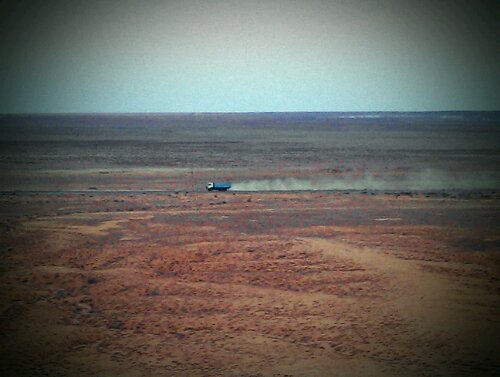 The second demon was a bout of diahorrea –not ideal at any time on a bike but least of all in the desert when there is literally nowhere ‘to go’ and you are desperately trying to keep your fluid levels up. It woke me up in the night with stabbing cramps in my guts but fortunately things eased off after about 24hrs. Just leaving me feeling completely sapped of energy –not helped by the fact I have to do the ‘snake stomp’ any time I leave the road. (For those of you who don’t know I have an irrational fear of snakes, so heading into the desert scrubland makes me pretty nervous. To try and minimise the chances of me and slithery things meeting ı would always stamp as ı walked as apparently the vibrations scare them off. Needless to say lots of toilet trips = lots of stamping!). In between all these physical challenges the desert is still an awe-inspiring environment. The sheer vastness and emptiness of it has a very reflective impact on your mind, somehow offering a huge amount of space for thought as you pedal endlessly across the land. I experienced a similar thing when I was walking and it is fascinating and sometimes a little haunting, to find your mind visiting memories, moments, encounters and ponderings that you had no idea were still stored in the vaults. As my body dealt with the work I had set it, my mind made far reaching plans for the future, missed people deeply and somewhere along the line found a remarkable sense of wonder at where I was and what I was doing. chaihanas we had listed on our km markers promised a shaded break from the saddle, something to drink other than warm water and often some basic food. Here and at many points along the way the cycle tourists became the tourist attractions. The trucks and cars that passed us would often stop to basically ask “what the hell are you doing!?” often people wanted to take our photos or would film us on their phones and many times we were given water. At the end of a particularly tough day battling the road surface and a headwind I felt pretty low and drained when a trio of truck drivers who had pulled-up for the night called us over. They were eating their dinner from the front radiator of the lead truck and introduced themselves as Vladimir, Vladimir and another name I forget from Russia. We were instantly offered vodka (by the signal of tapping the neck as if checking for a pulse) and meat and pastries from their dinner. It could have been my mood but that was the best vodka I have ever tasted. As they poured out the end of one bottle it was tossed over Vladimir’s shoulder and another was opened with big smiles and more photos. We had to make our excuses to avoid getting totally wasted by the roadside but the last couple of kms before pulling off into the scrub to camp were tipsy bliss and I grinned from ear to ear.