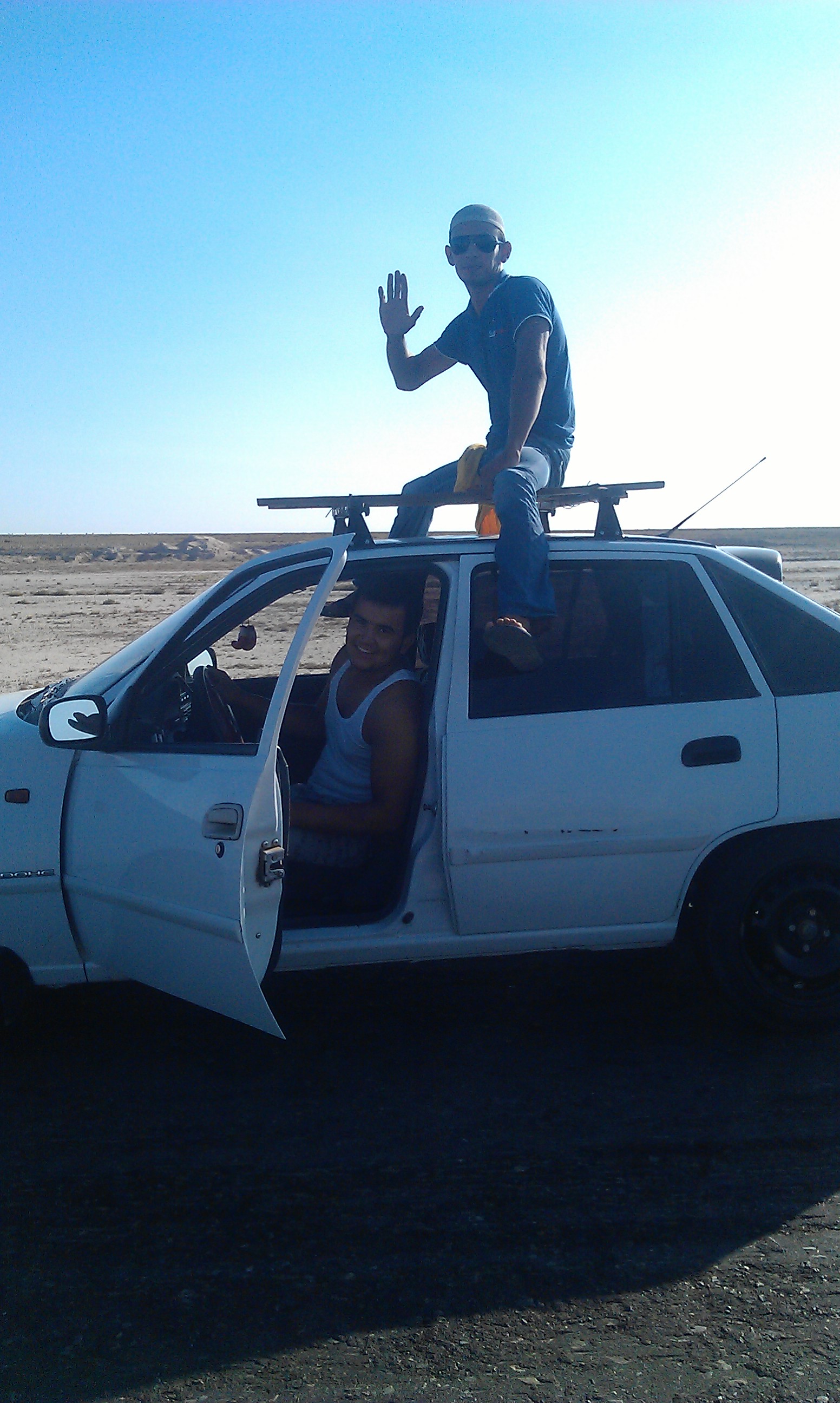 We pushed on into the searing afternoon heat knowing it was a long stretch (170km) until the nearest town and next water stop. Just before dark a car stopped to say hello and we met another Mongol rally team, they had just spent 7 ½ hours at the border compared to our 1 ½. We camped with them for the night just off the side of the road but left early in the morning to take advantage of the brief cool that dawn provides. A few kms further on another car approached, as the road was straight I could see the outline for several kms before it reached us and the shape on the roof was very confusing. A dark silhouette that looked almost human, slowly leaning side to side. When it got nearer it turned out not to be a trick of my eyes or the heat, but there was actually a guy sitting on the top of this car with a scarf tied across his face. He hopped off the roof as the car stopped beside us and started asking for documents – but none of us were about to start getting our passports out for an un-uniformed, random guy riding through the desert on the roof of a car and treated him with slightly hostile suspicion. After an entertaining mimed conversation illustrated by drawings in the sand we managed to understand that he had lost a briefcase of documents and was looking for them along the road – welcome to Uzbeistan! (We later found out he had left the briefcase in customs and had to drive back over 150km to find it – all this time scanning the sand from the top of the car!)