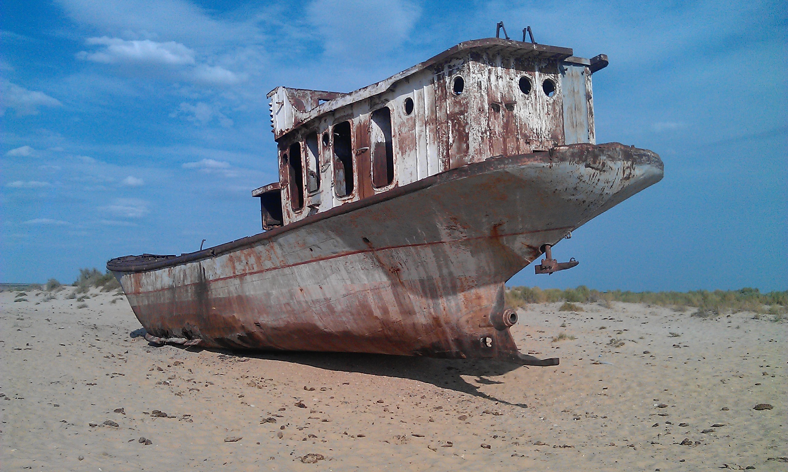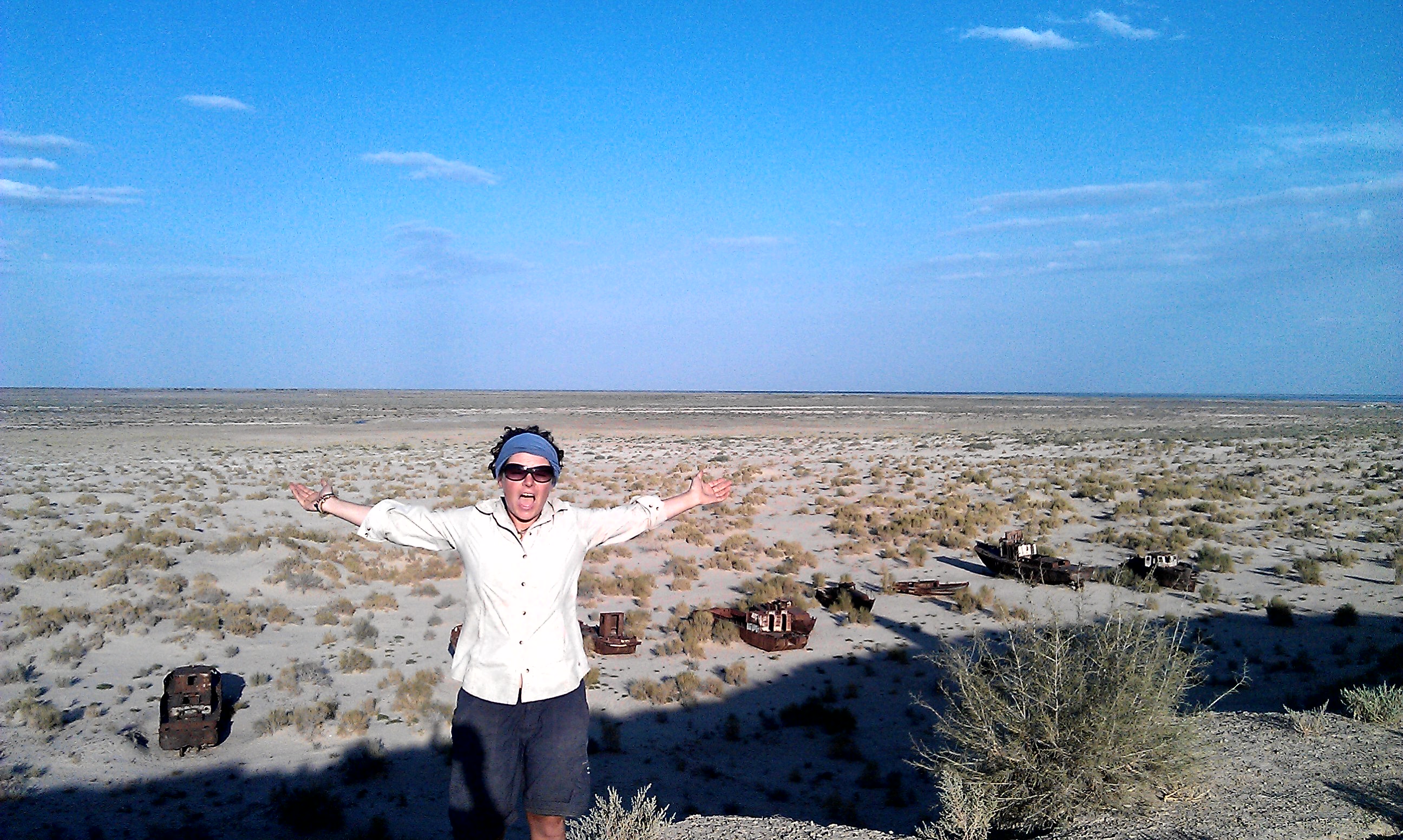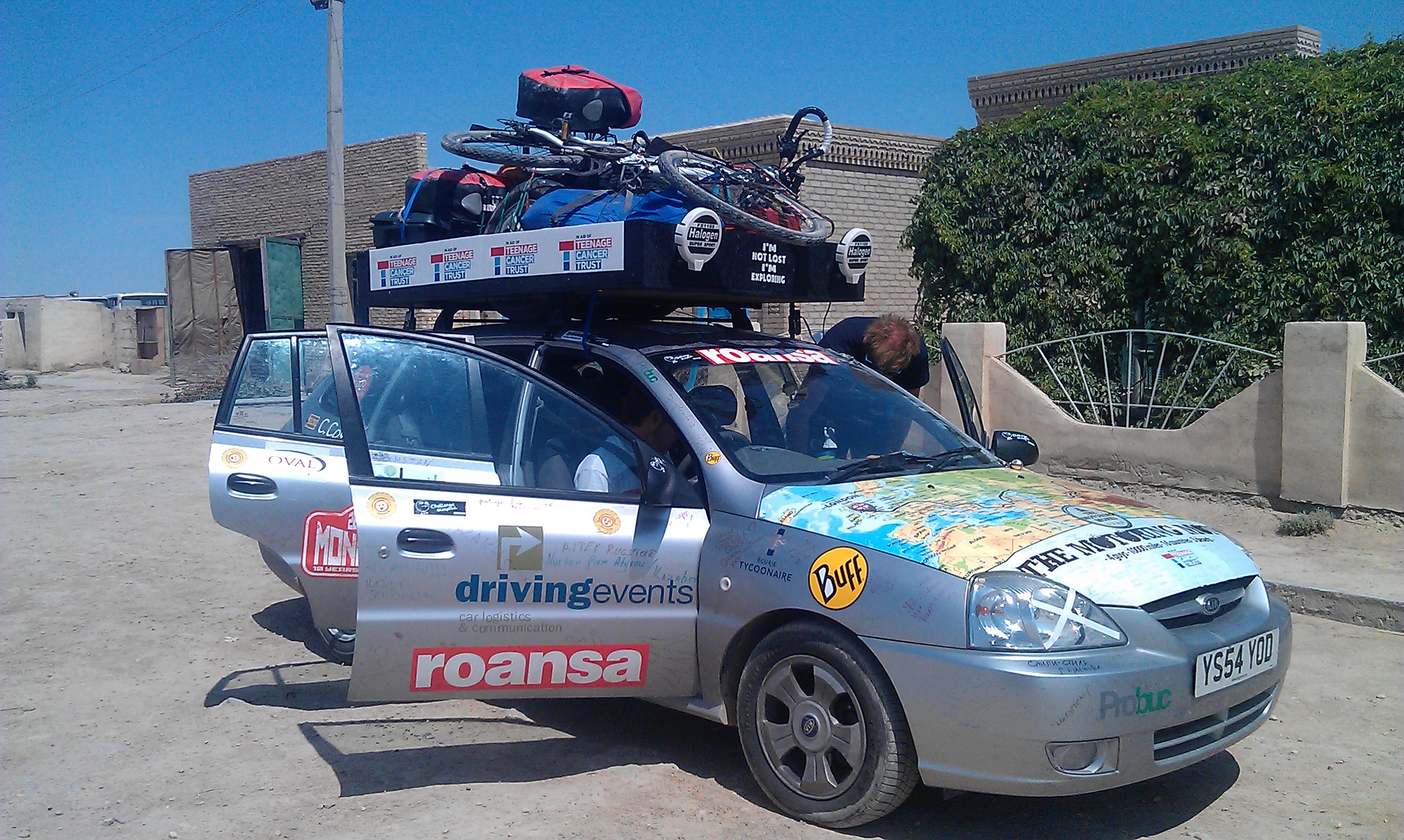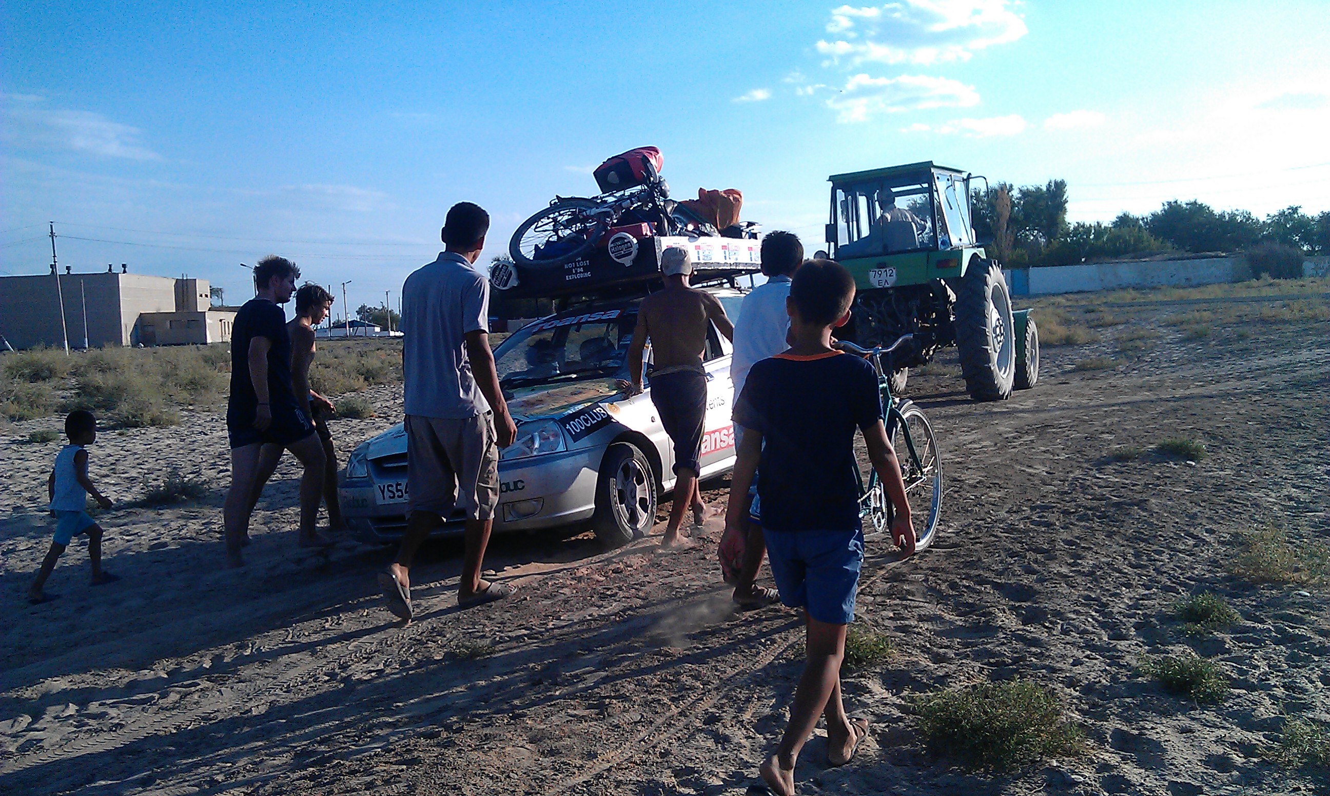 There was not a lot of other traffic on the road which was more long, straight desert and I had been toying with the idea of hitching a lift to the first city of Nukus. So my luck was in when the Mongol rally team (finally having woken up) caught up with us a chaihana (tea-shop) and I asked them if they had room for me and Carra. They were more than happy to strap the poor girl on the roof and squeeze me into the backseat and let me join them for the day. I said a sad farewell to Claire and Mark, although I was pretty sure our paths would cross again in Uzbekistan, and suddenly I was taking part in the Mongol Rally! I was given the honorary title of “Motoring Nun” alongside the self-titled “Motoring Monks” who were Will, Josh, Carlos and Flo. 4 friends who had just finished boarding school and were now on the trip of a lifetime to Mongolia in their pride and joy “Kiapatra” raising money for charity (see their site here). I spent the next 24hrs with them as we had a mini adventure; searching for petrol (there isn’t much sold in Uzbekistan), taking a detour to Moynac (the former shoreside fishing town that has born the brunt of the environmental catastrophe that was the Aral sea) to see ships in the desert, getting stuck in the sand and towed out by a tractor, camping by the motorway in the pitch black, scoffing our way around Nukus bazaar. All of this safe in the knowledge that one of them had only learnt to drive in the Kazak desert! They were a great company and I am happy to say they made it to the Mongolian finish line – good job lads! 🙂
