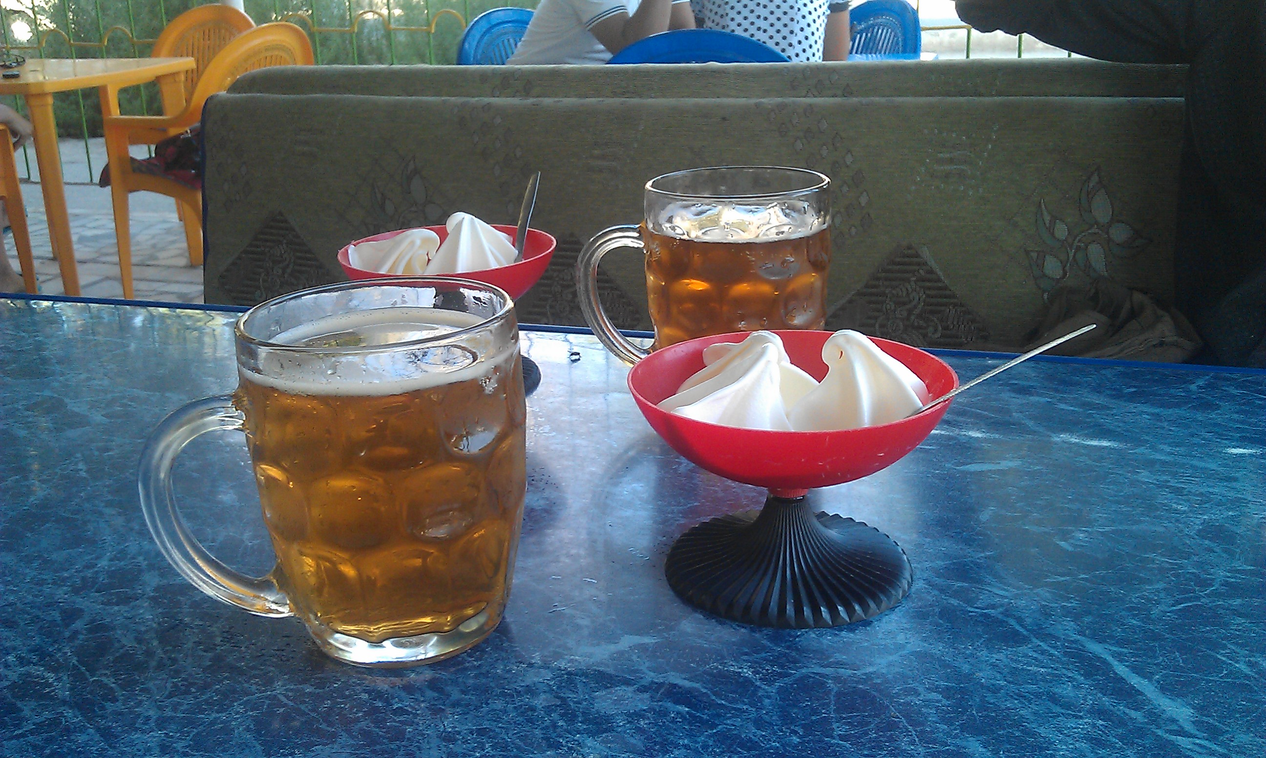 The city of Nukus was my first Uzbek metropolis and whilst having the feel of an ex-soviet city albeit being heavily revamped, it had a few attractions for me – food (a big selection of, running water and an unusual art collection. The food was in colourful abundance at the huge bazaar, running water never looked so good after 3 weeks in the desert (even if it was a bit brown in the bathroom of my soviet style hotel room in the cheapest place I could find!) and the art collection is a great story of KGB money being used to collect art that the soviet government wanted to ban and then to hide it all in a city in the desert! The story of the Savitsky museum, named after its’ mastermind is told in the film “The Desert of Forbidden Art”. Just round the corner of this museum was a very popular cafe/bar that I passed a few times until the temptation was too great. Every time I passed the only things I saw on the tables were beer and ice-cream – heaven! But when I tried to order 3 of each (I was with 2 cyclists – not just very greedy) I was told there was no beer. I pointed to everyone at the tables and said beer, beer, beer but was again told ‘beer – no’. So I ordered 3 of whatever was in the glass. Turns out it is a gas water and syrup combination, very nice, especially with ice-cream but from the photo you will understand my confusion!