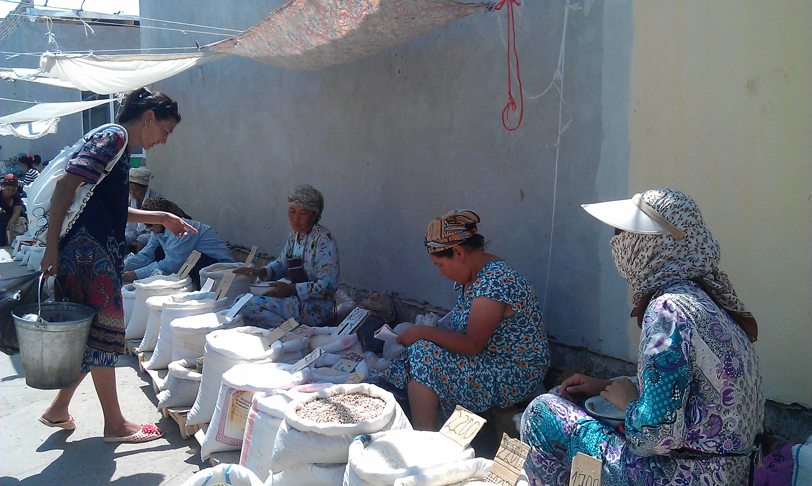 Thankfully the Uzbek border was not really the problem the rumor mill had led us to believe. There was of course a crowd of people hanging around at every gate and not much indication as to what or where we were meant to go but as a group of 5 cycle tourists we were soon waved to the front of each crowd. It was a little embarrassing and I felt very bad for the locals who must use this crossing regularly, but there was not one complaint from the sea of gold teeth smiling at us, as they were made to continue waiting in the heat. Declaration forms, multiple passport and visa checks (one by a guy in uniform who struggled to understand that all our passports said Great Britain but we are all from ‘Anglia’ as it’s known in Russian. He was then obliged to enter each of our details into a computer with only his index finger and a look of complete confusion) a few verbal inquiries as to whether we had any guns or weapons, debates about whether we have to declare our bikes as vehicles or not and general hanging around, but eventually we were given a vague wave in the direction of the gate. And we were in Uzbekistan! I’m sure the temperature increased by 10C and directly outside the border point gates there were 2 things available; water and money. The water we had stocked up on but the money we needed. Changing any currency to Uzbek som is an experience because it is a closed currency, controlled by the government, so the black market offers a 30% better rate and is the only way to go. But changing $10 gives you about 27000 som, the biggest note is 1000 and it is all done out of a black bin bag. (At the bazaars there is also half an eye open for the police but they know exactly what’s going on and no doubt get their reward for a blind eye!)