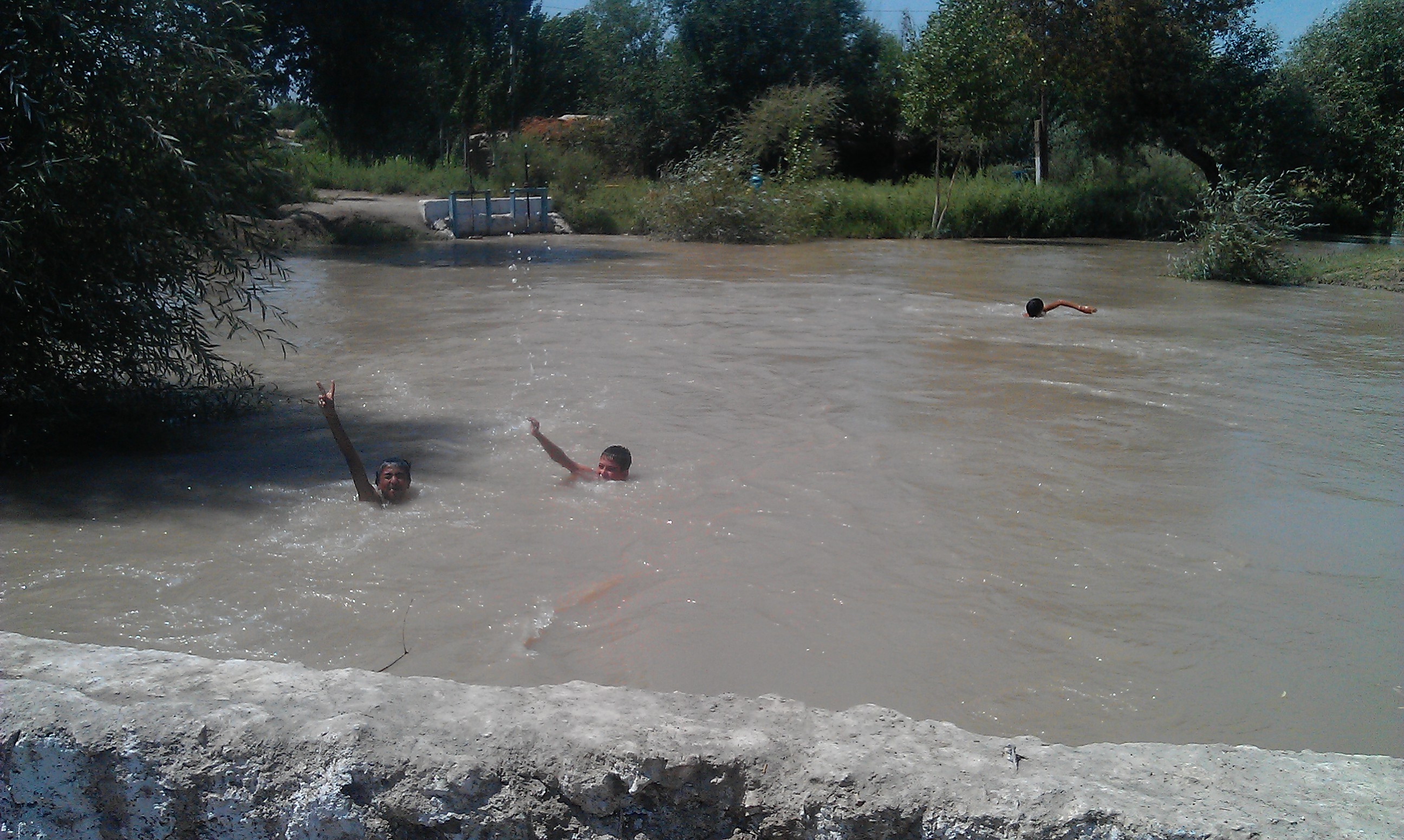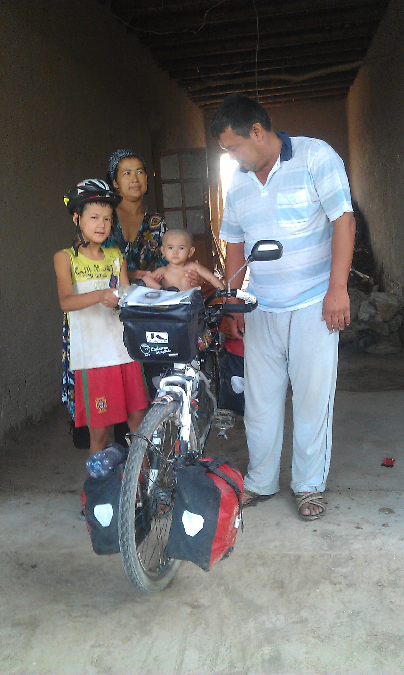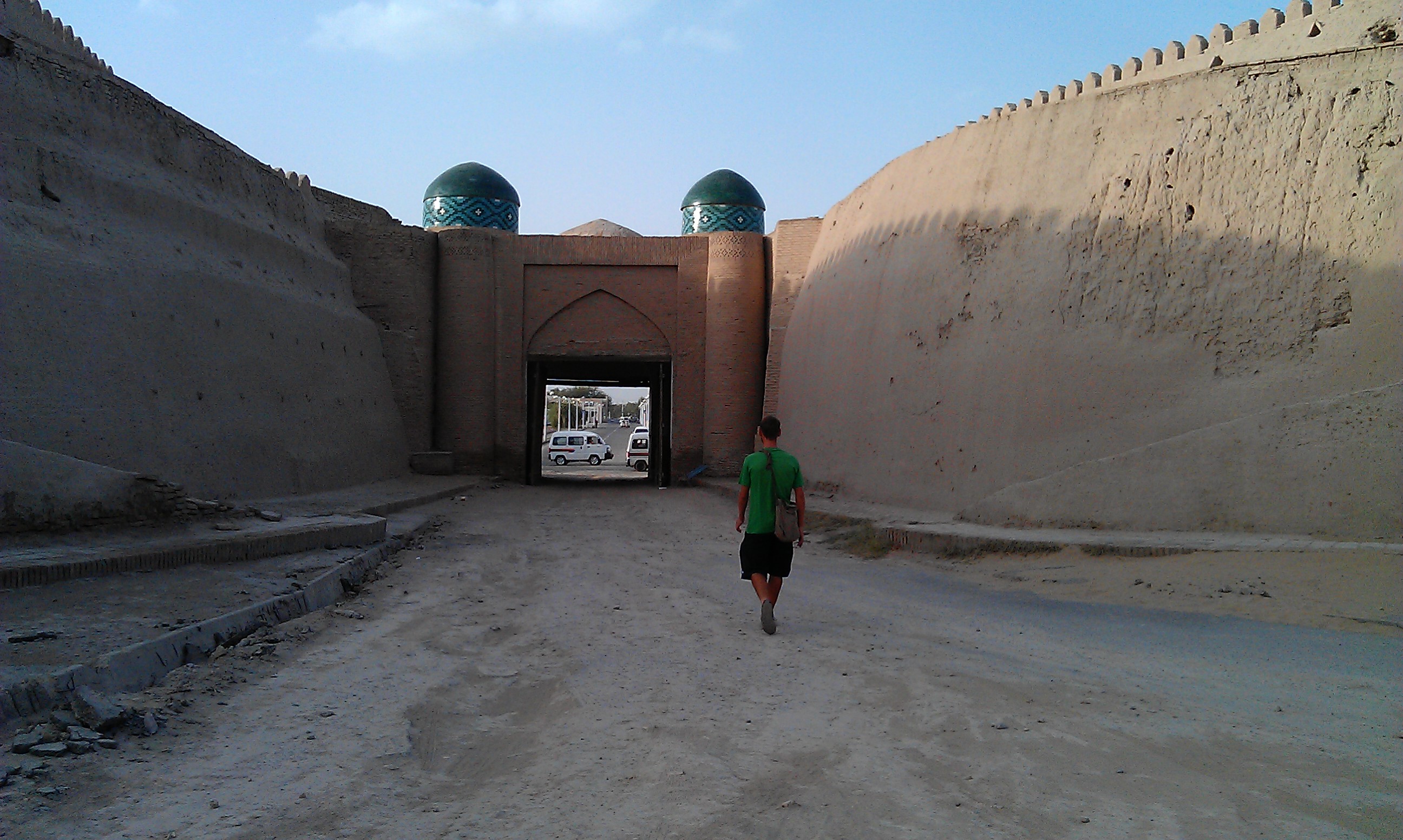 From Nukus I made the 2 day hop south to the ancient silk road city of Khiva. On the way into Nukus the desert had dramatically turned into green farmland in the space of just one hill and the landscape did the same in reverse on the way out. I battled a headwind again along this stretch before turning off to join the mighty Amudarya river that irrigates much of central Asia. The change in landscape was dramatic again as I found myself riding through swarms of huge dragon flies alongside fields of cotton and other crops, past villages of mud houses and groups of kids swimming in the coffee brown waters of the irrigation channels and ditches. It was another world. I was invited to stay with a family in their house for the night and fed the national staple of plov, washed down with beer, vodka and green tea.