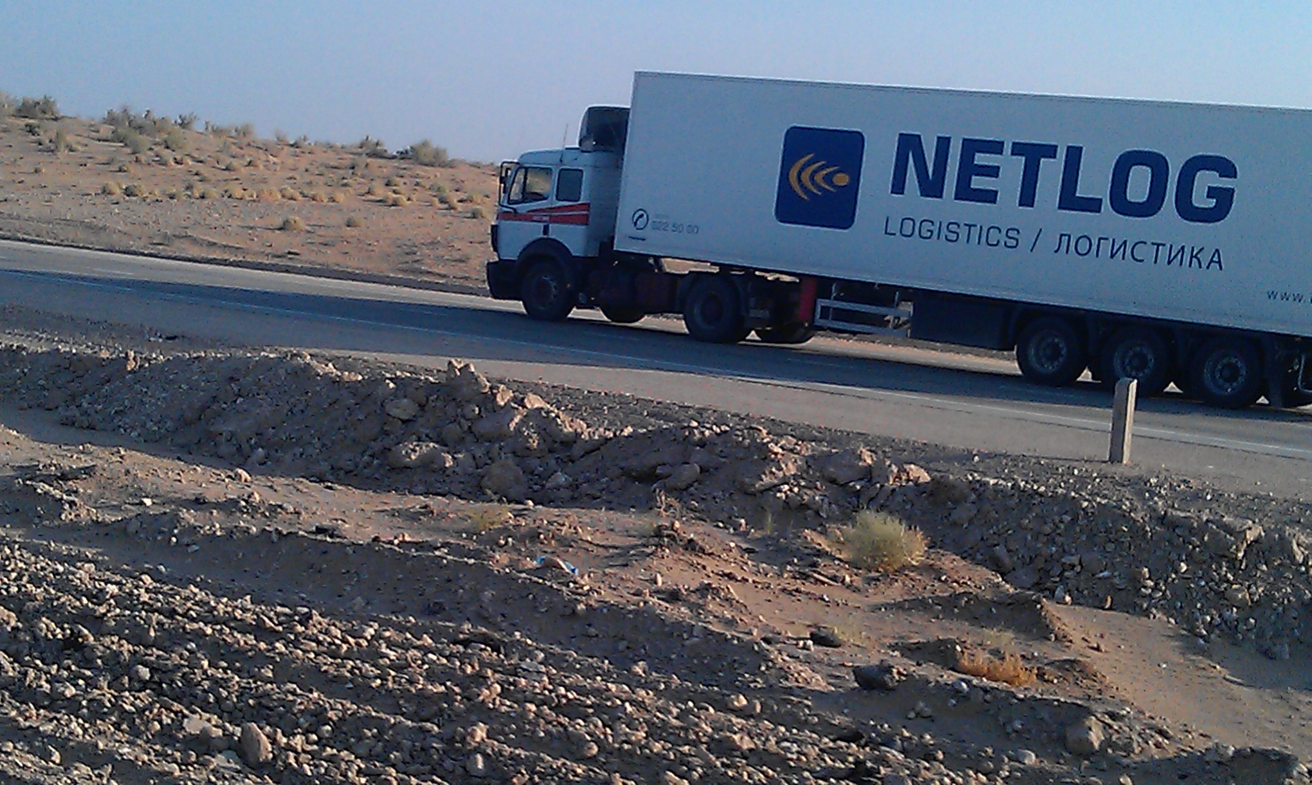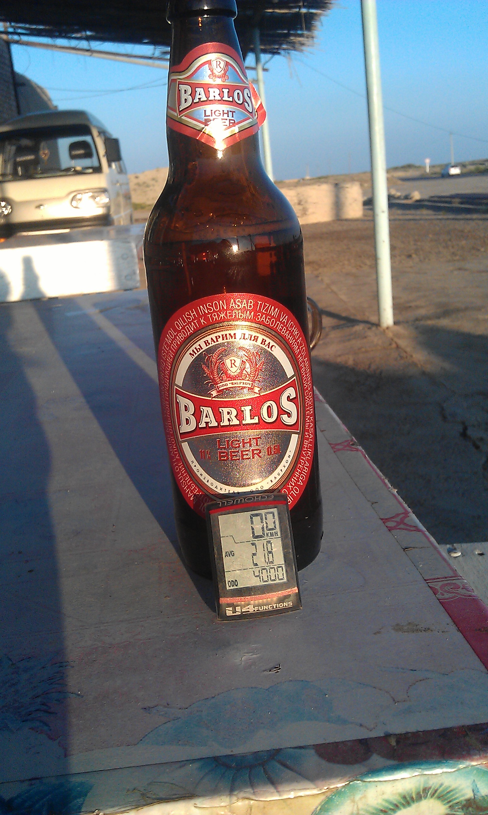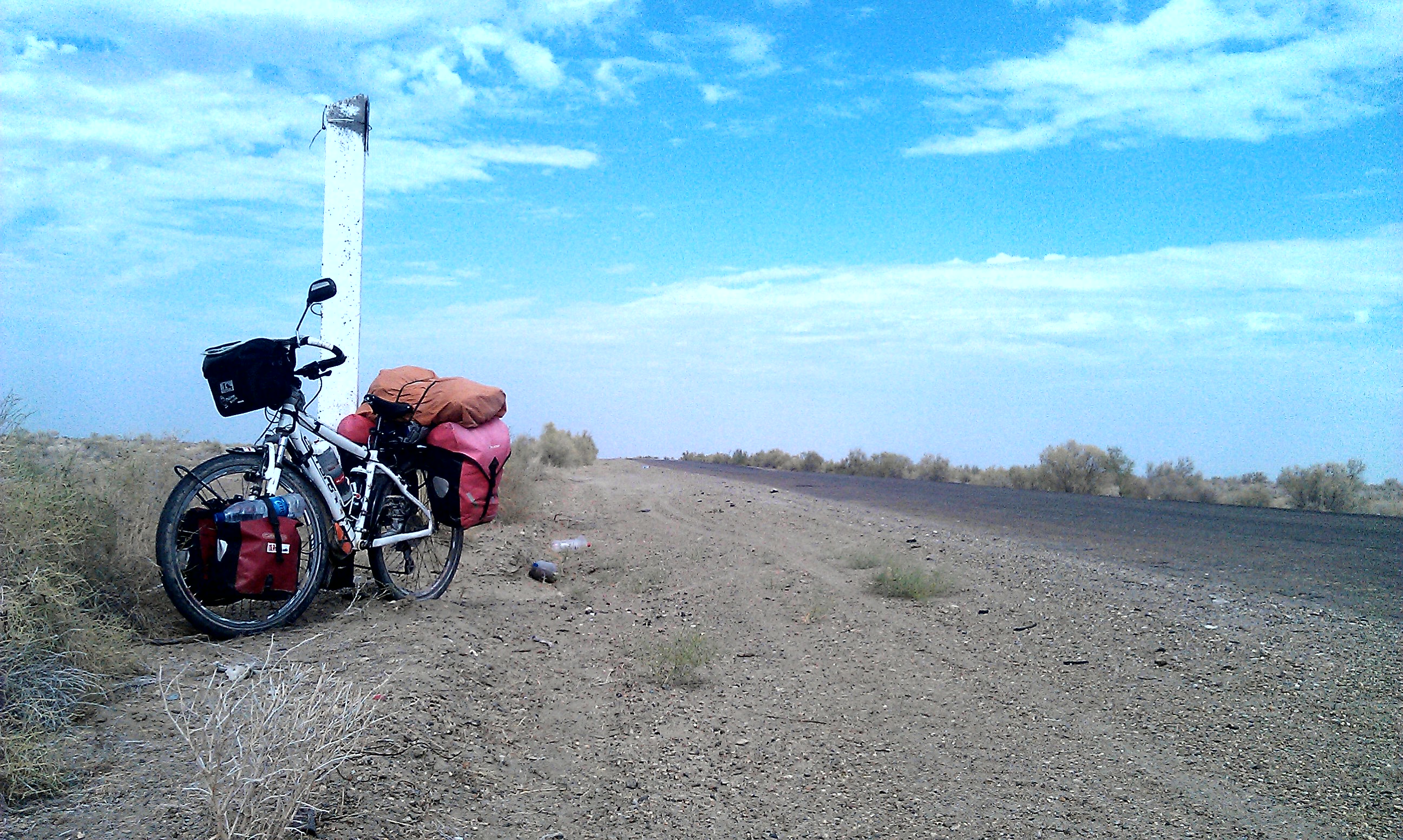 In this case I cycled out of view of the checkpoint and bridge, waited for the next train to go by then began dragging Carra over the tracks and into the desert. But not all deserts are the same and this was the first time I had found myself in fine sand – a nightmare for a heavily loaded bike; the wheels just sink and grind to a halt. The next 3 nights, whenever it was time to stop, I had to unload half the bags and do a relay into the sand to move all my stuff to a suitable camping spot. It’s the last thing I felt like doing after long hot days in the saddle, with the help of some good roads and tail winds I was managing 130-150km per day and needless to say I was pretty shattered at the end of each day. One of these days coincided with the end of Ramadan and at a chaihana, (next to yet another police check,) 3 truck drivers insisted on buying me dinner – 1 meal from each of them! – as their gift to me. The next day I clocked up my 4000th km on the bike computer, I stopped to take some photos to mark the event and didn’t realise I had not properly re-placed the counter on the sensor. So the next time I stopped I was still on 4000km. As this was at a chaihana (just short of another checkpoint) that was selling beer I decided to celebrate the distance with a couple of cold beers, asked if I could stay the night and spent the evening watching the traffic come and go listening to Uzbek radio – much better than dragging all my stuff across the sand to find a hidden spot to camp. I shared the room in the chaihana that night with a family of swallows who had a rope set up from wall to wall so they could perch between their nests and I could perch between their piles of droppings!
