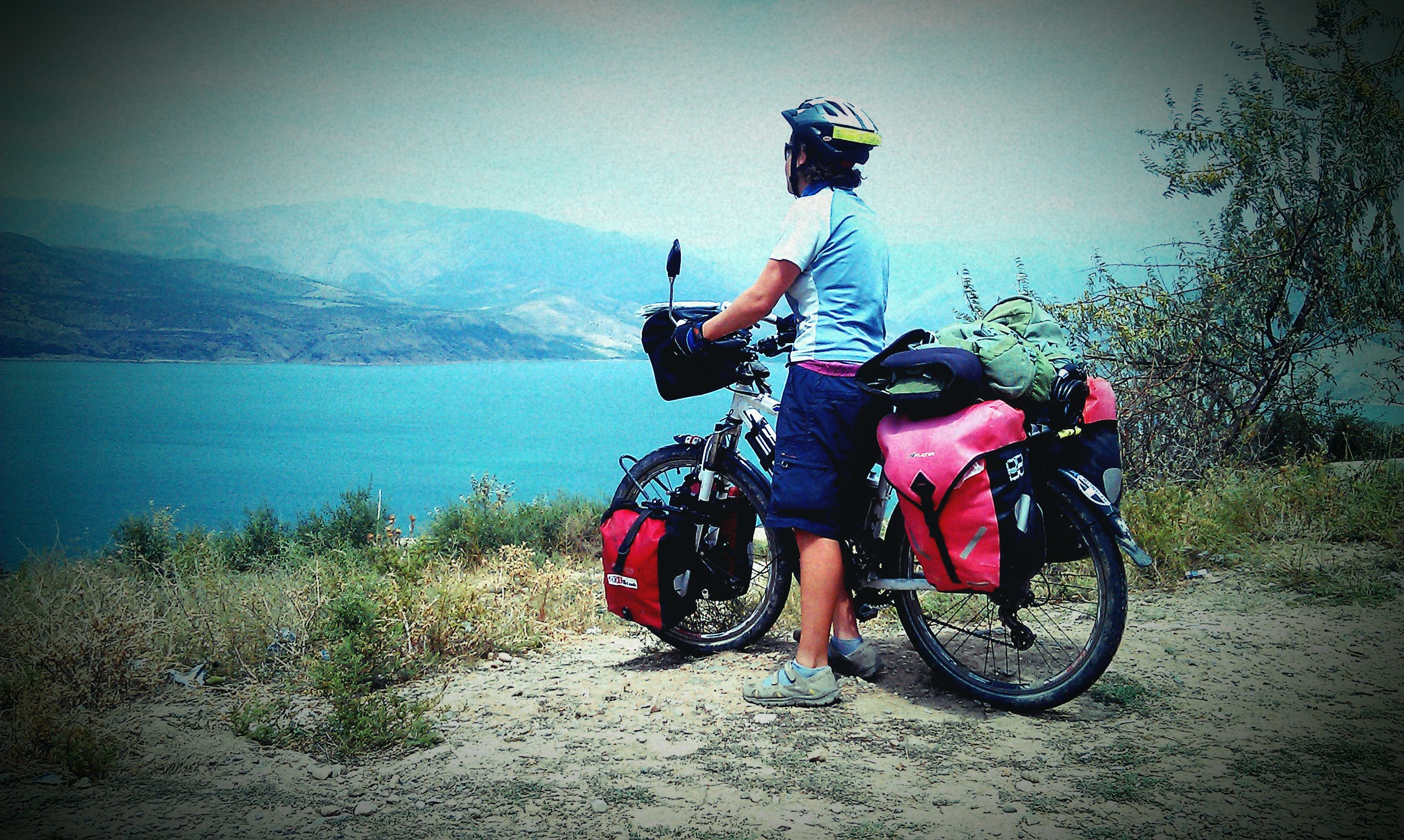 Another reason for heading to the lake was to observe a personal landmark. The km counter was ticking towards 4500km – this was the same distance I covered on foot to Istanbul. I’m not sure why I felt it was so significant but I had decided I did not want it to happen on a busy street in the city and felt it warranted a few days by the lake. I was about to become more cyclist than walker, but Carra had her own celebration in mind. Just as I was starting to look for a camp spot she sprung her first puncture of the whole 4470 (or so) km. I unloaded everything and changed the rear inner tube just as the light was fading, afterwards I rode on into the dark but found nowhere to stop so resorted to asking to pitch my tent in the field of the only house with any light on. Needless to say I was invited in, fed and watered with chai and the same again before I continued on my way in the calm of the lakeside early morning. The next day Carra again tried to interfere with the occasion by shearing a bolt that was holding the front bag rack on, but some swearing and some cable ties saw to that. I found a perfect camp spot high above the lake and watched the sun go down with a bottle of vodka (and unfortunately some Uzbek dance music for most of the star-lit night from a holiday spot on the opposite shore). As I was leaving the lake to head to the Tajik border I crossed the 4500km mark whilst zooming down the other side of the dam. I am not sure if it was the vodka but something was also trying to zoom down inside of me and I made a few emergency roadside breaks on my way to the border. At one of these breaks I saw Igor again, he was out on a Sunday ride but I couldn’t say more than “hi” as I headed for a hedge. I was leaving Uzbekistan with one of its best known souvenirs SSS (Stan Stomach Sorties – my affectionate term for the travelers right of passage in central Asia – diarrhea, you can not escape it!!