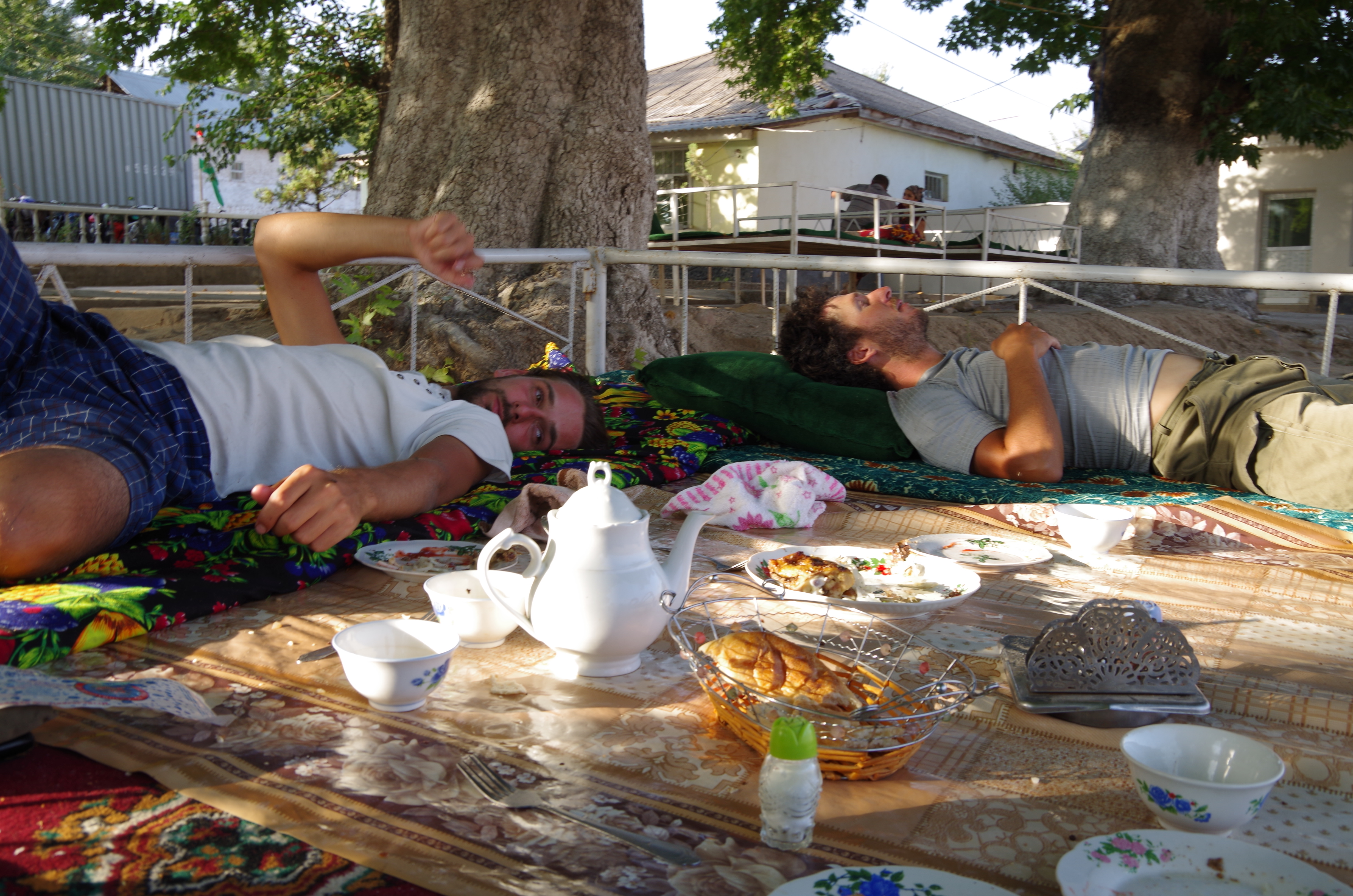 My bike repair session immediately backfired as I had to stop in the afternoon for a puncture (only my 2nd since Istanbul!) and to re-align some gears. By the evening, we were well clear of the city and following a vast riverbed. After a stop for dinner in a chaihanna, with a view to die for, we set up camp in some fruit fields. Unfortunately my excitement at eating real food again (and being back on the road) also backfired as just after we set up camp I projectile vomited the aforementioned chaihanas’ delicious (but clearly a bit rich for me) food. Good start!!