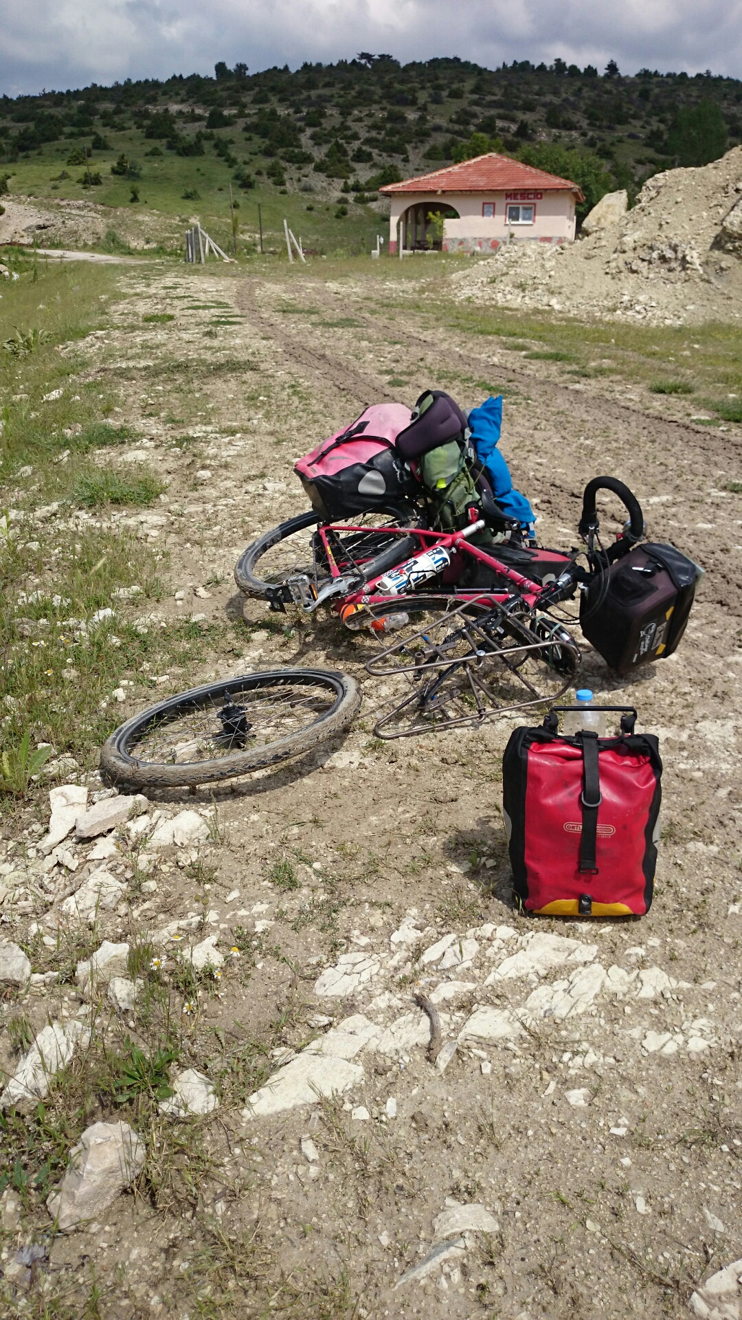 After a patchy nights sleep I packed up, and wobbled my way out of the undergrowth and back towards the main road, surprised at how little ill effect there seemed to be in my muscles. My skin however had soaked up the previous day’s sun through the clouds and was rosy pink. The road continued climbing again after Orhaneli and wound it’s way through pine forest and small villages, where people were mostly scarce and trees were plentiful. At my second breakfast break I had to readjust the front pannier racks and as I turned around I saw a mountain fox scurrying down the hill away from me. It stopped in its tracks and stared at me for a few magical moments before disappearing into the bushes.