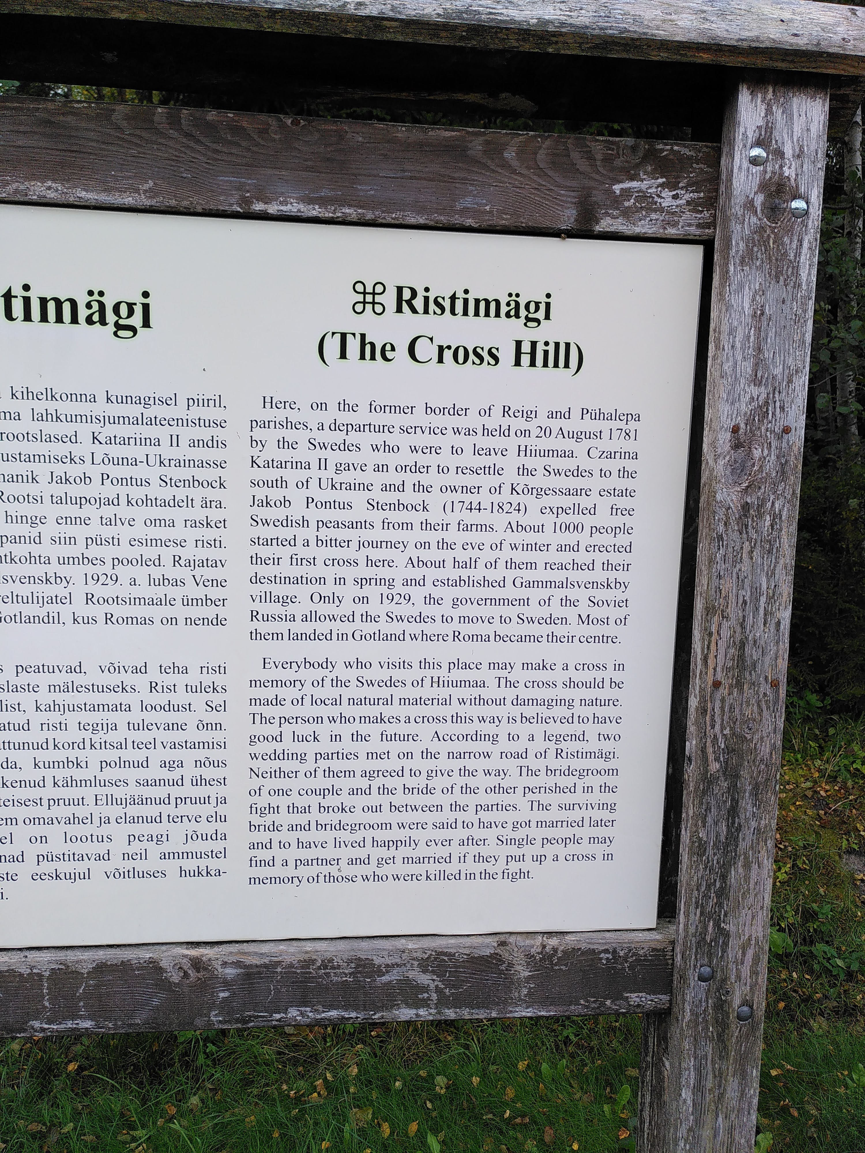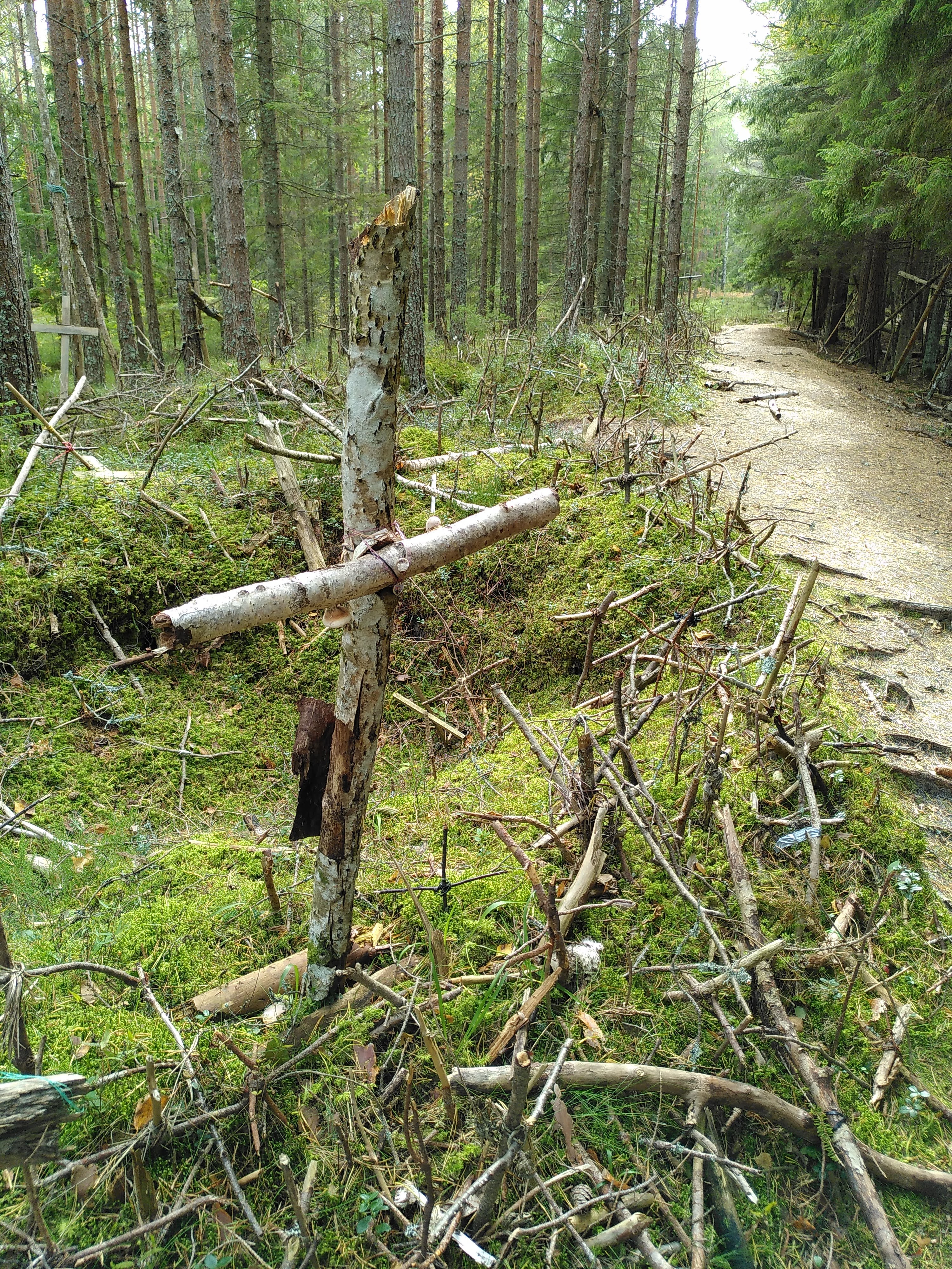 An information board in a small layby on the opposite side of the road explained that this was the cross hill. I had not seen a hill since the old town in Tallinn and I was struggling to identify one here, let alone an angry one. I also couldn’t see any crosses. But there was a small track heading in the direction of the wind and towards the forest so I had a little look. Then the crosses started to appear, mainly rudimentary wooden crosses from fallen branches and sticks, but then more from other found materials. They multiplied in number as I went further and due to their significance (see info board photo for explanation) what could have been very creepy became ever more moving and poignant.