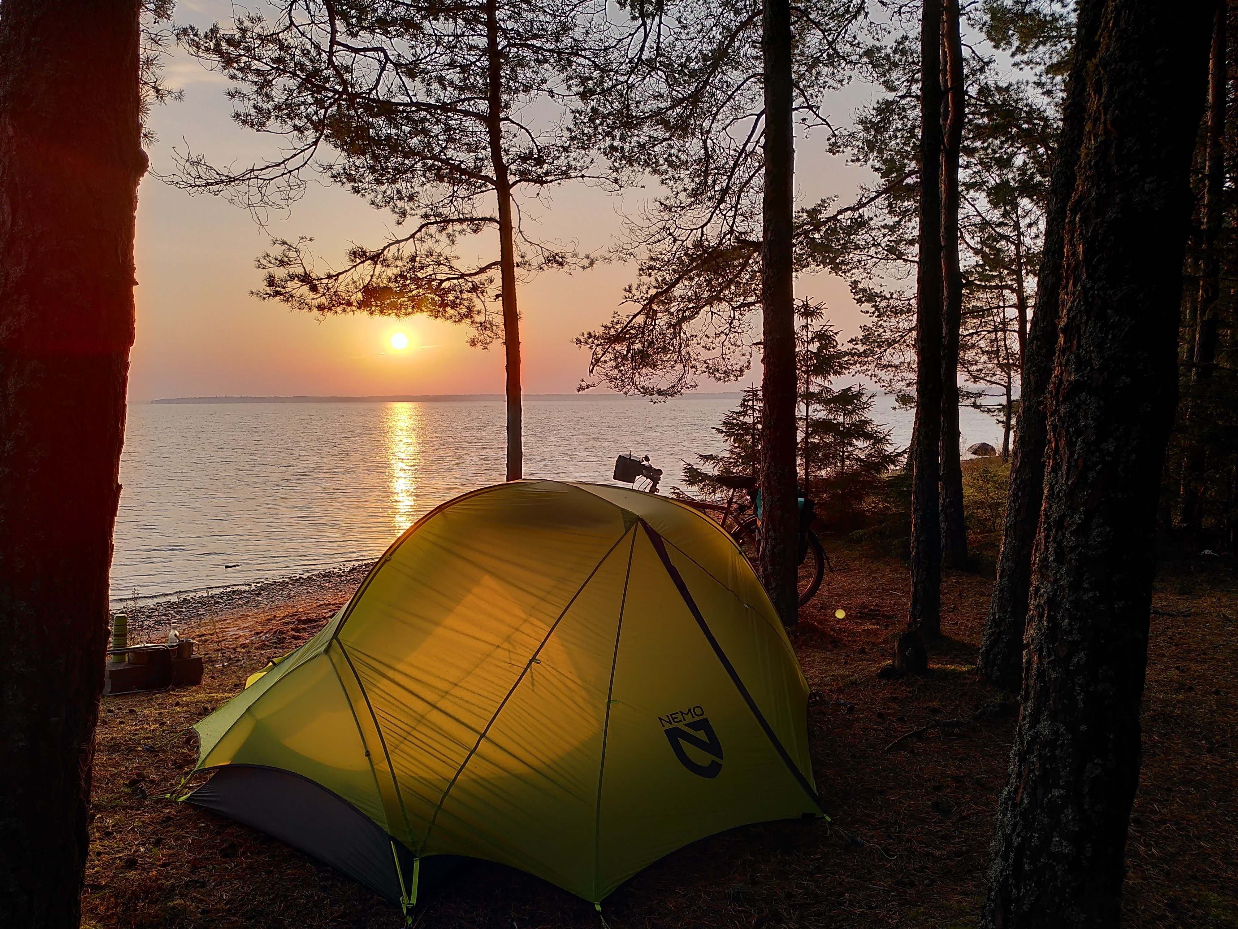 Water sorted, I headed back out of town into a growing head wind to find my home for the night, and like the RMK sites I had visited on the mainland, it did not disappoint. Sheltered from the wind and right on the waters edge I was almost tempted in for an evening swim, until I got up to my ankles. I have definitely lost my cold sea swimming hardiness from living in Cornwall. The perfectly placed trees on the waters edge meant that this was definitely another hammock spot. And in the morning I watched the dawn break over the still waters from my sleeping bag. Magic